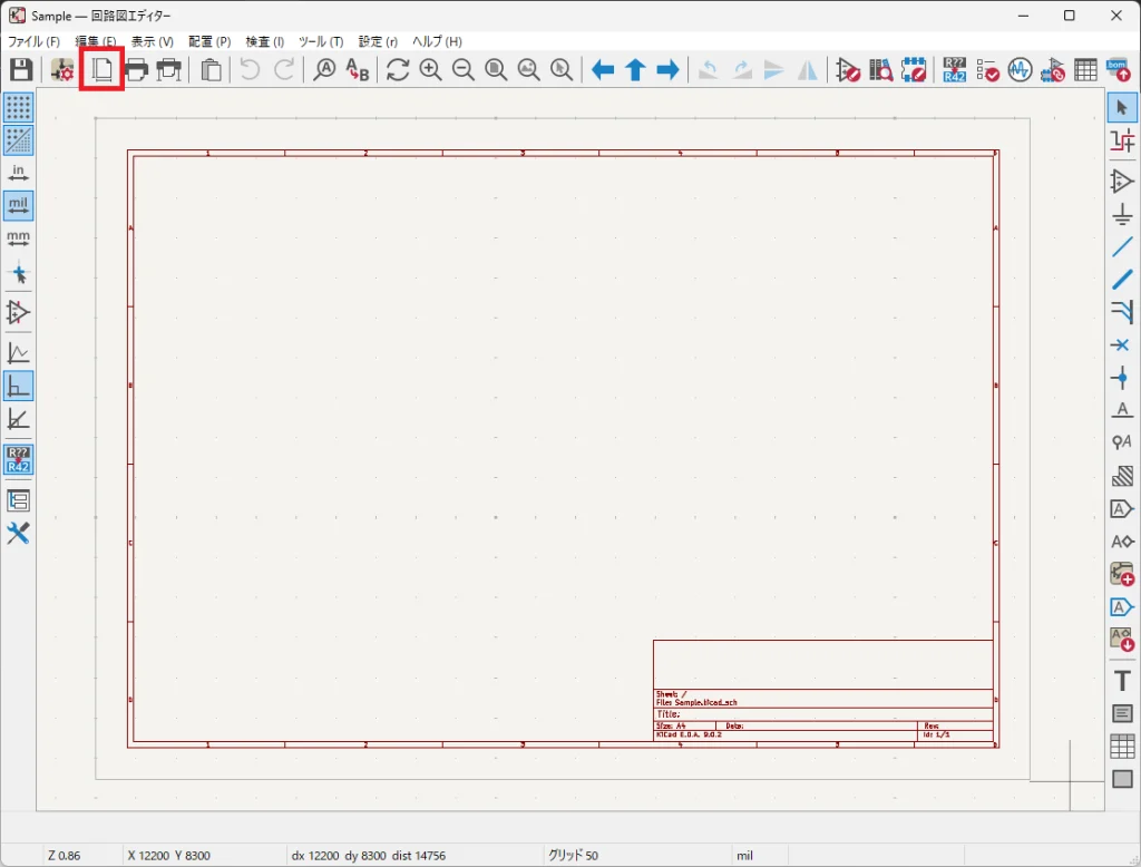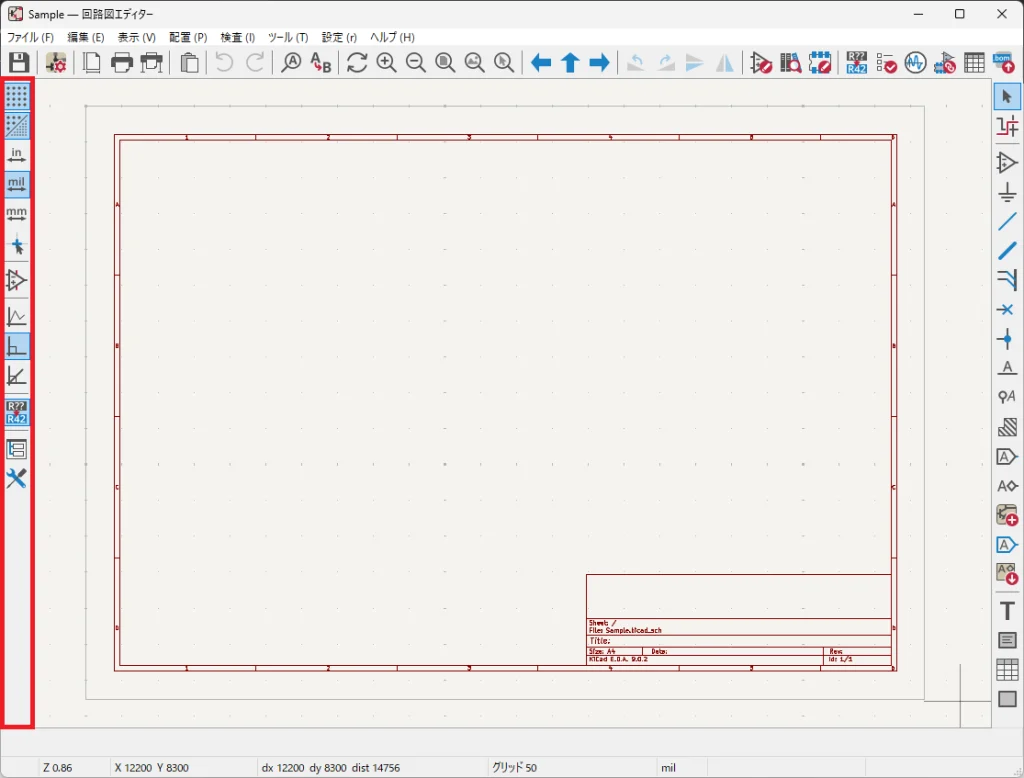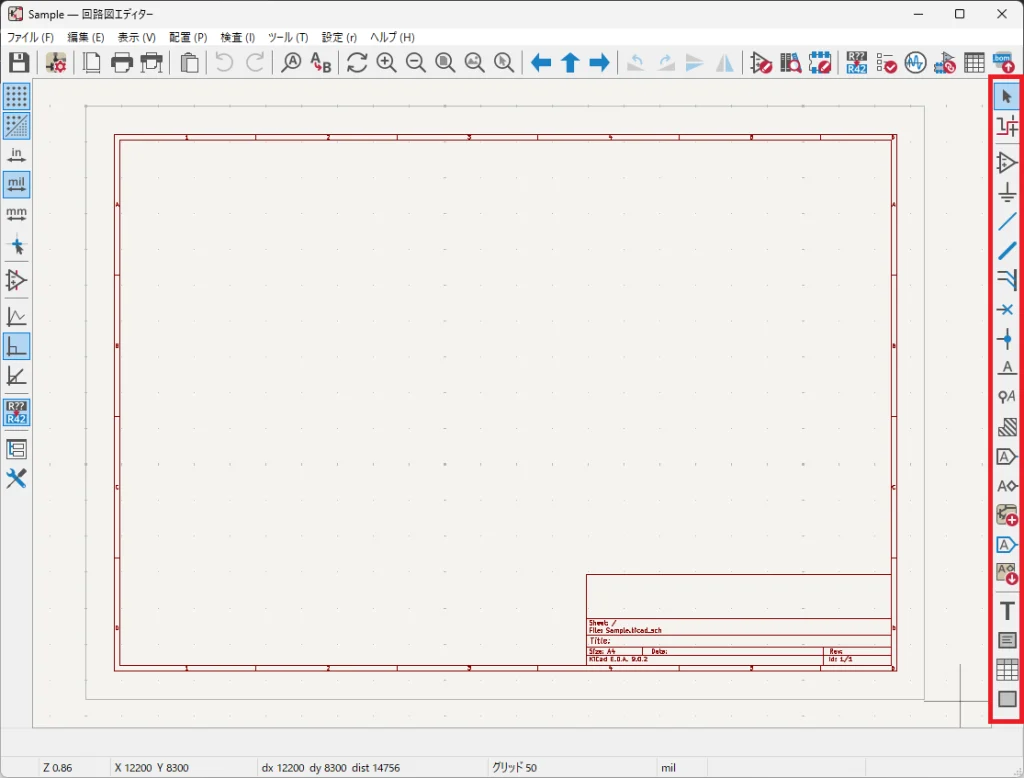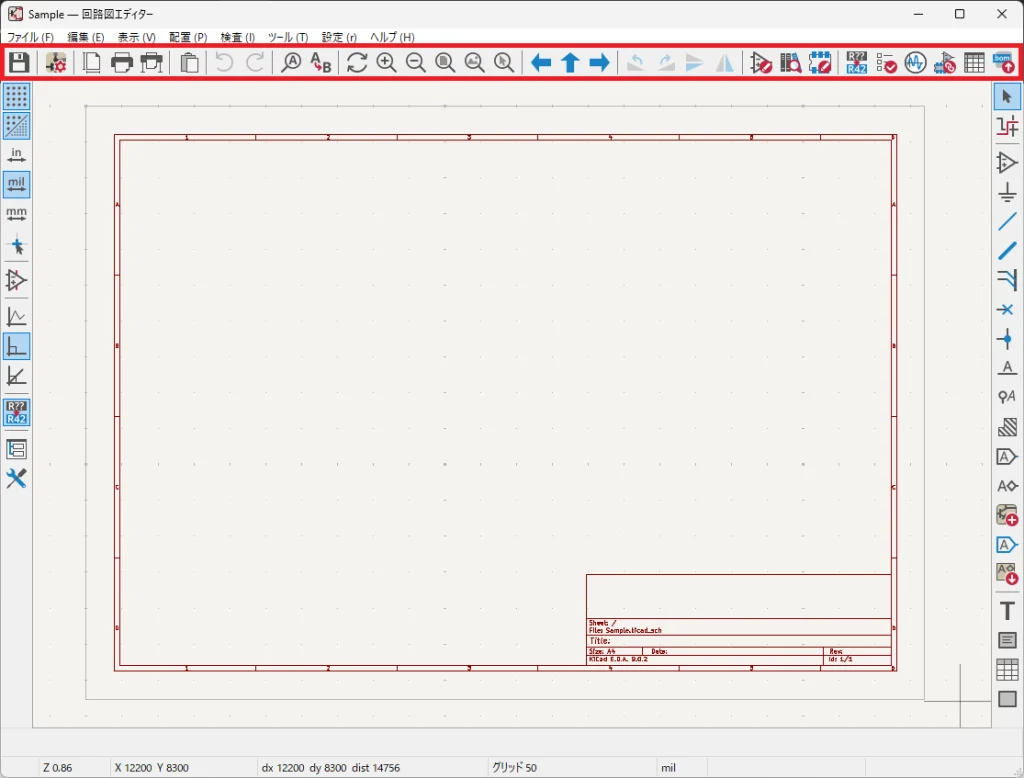 画面上側は回路図の保存や印刷、ページ設定などファイル操作ができます。また操作の取り消し・やり直しボタンやシンボルライブラリの編集ボタン、電気的ルールチェックが行える ERC チェックボタンが配置されています。