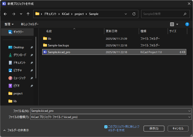 任意のフォルダにプロジェクトファイル(*..kicad_pro)が生成され、回路図用ファイル(*..kicad_sch)とPCB用ファイル(*..kicad_pcb)も同時に作成されます。