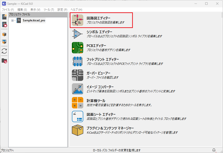 プロジェクトを作成したら、「回路図エディタ」をダブルクリックして開きます。