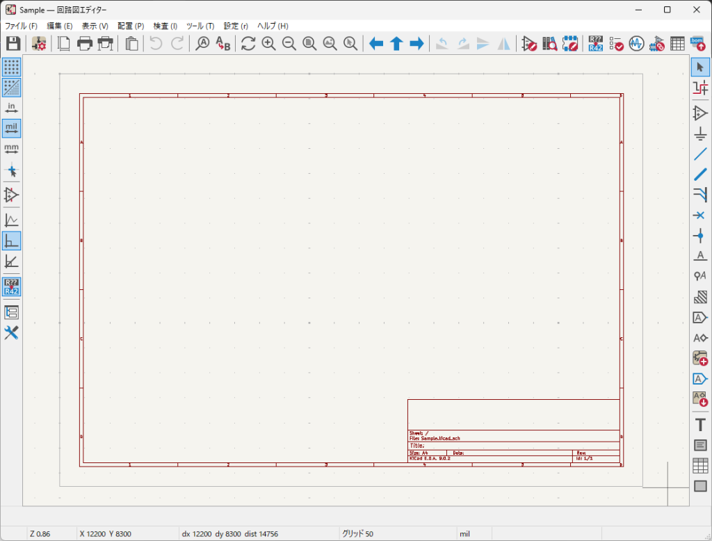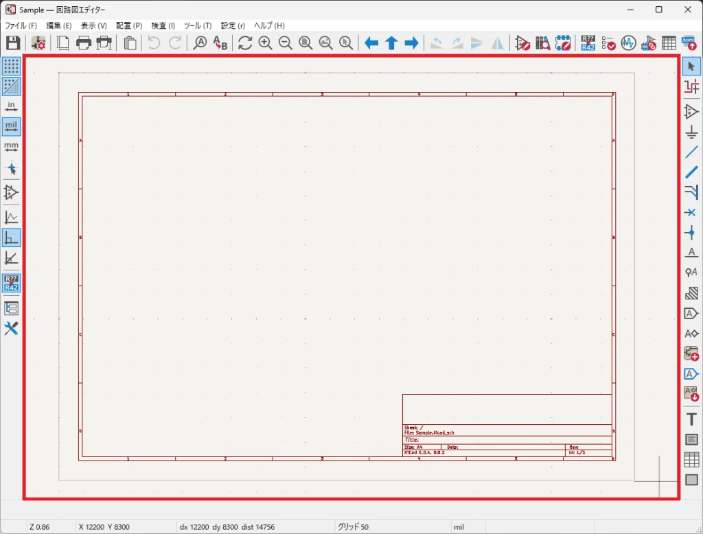 画面中央は回路図を作成するエリアです。シンボルや配線、電源、ネットラベルなどを配置・編集します。