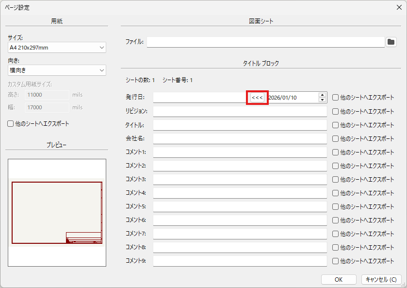 右側は発行日やリビジョン、タイトル、コメントを入力できます。発行日は下図の赤枠部分の[<<<]ボタンをクリックすると日付がシフトされます。