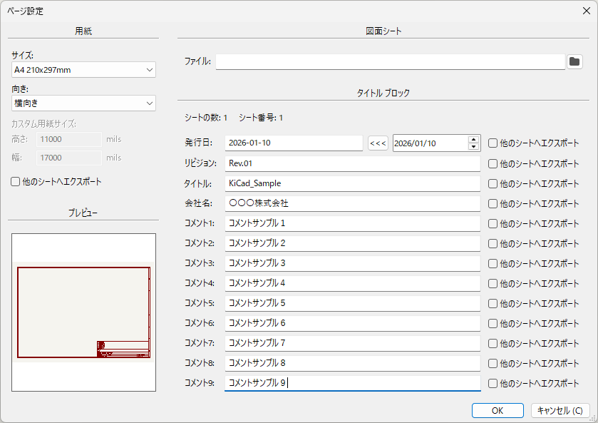 ページ設定では、用紙サイズとタイトル ブロックの情報を設定できます。