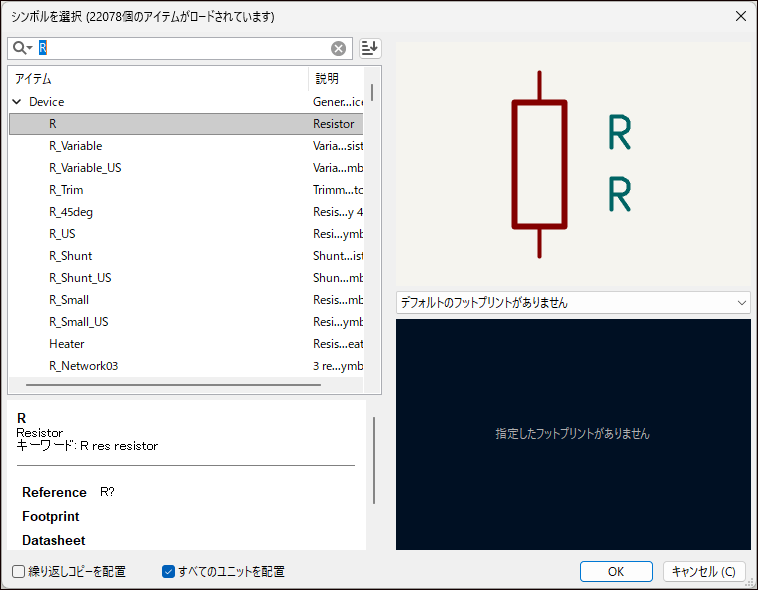 抵抗の回路記号は検索欄に「R」と入力することで、抵抗が選択できます。