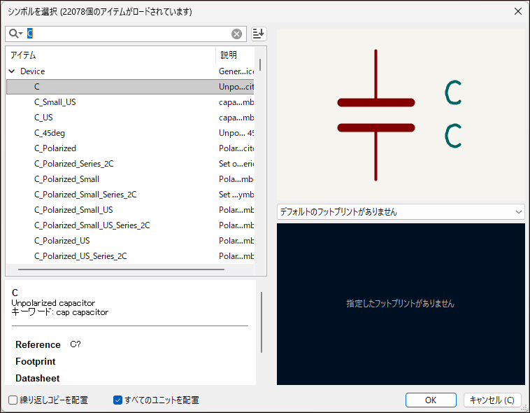 コンデンサの回路記号は検索欄に「C」と入力することで、コンデンサが選択できます。