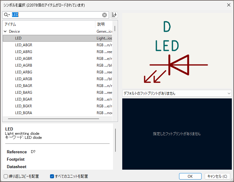 LEDの回路記号は検索欄に「LED」と入力することで、LEDが選択できます。