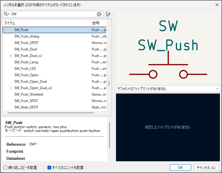 スイッチの回路記号は検索欄に「SW」と入力することで、スイッチが選択できます。