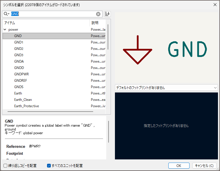 電源に関する回路記号も用意されています。検索欄に「power」と入力することで、電源が選択できます。また検索欄に「GND」と入力すると、GNDを選択できます。