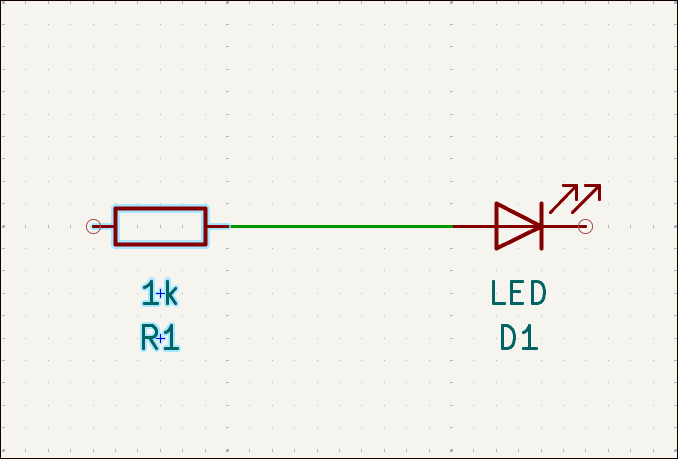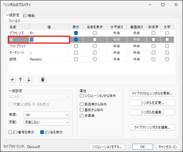 ここでは抵抗の定数を 1k に設定しました。[OK]ボタンをクリックしてシンボルのプロパティ画面を閉じると設定した内容が反映されます。