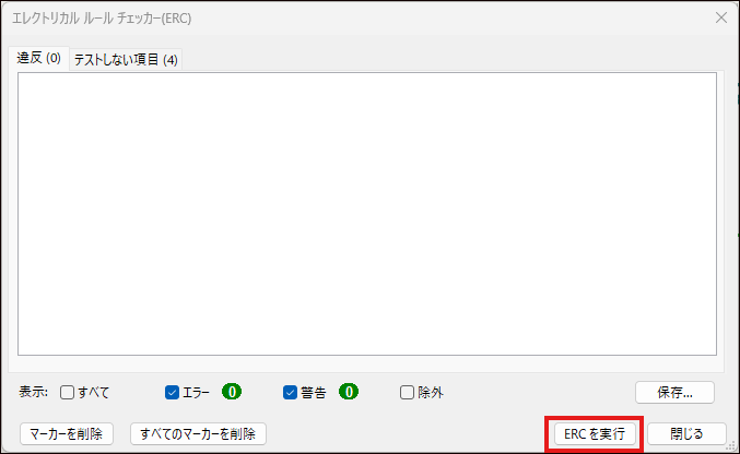 [ERCを実行]ボタンをクリックして回路図にミスがないかチェックします。実行結果が表示され、エラーや警告が一覧で表示されます。エラーや警告が表示されなければOKです。