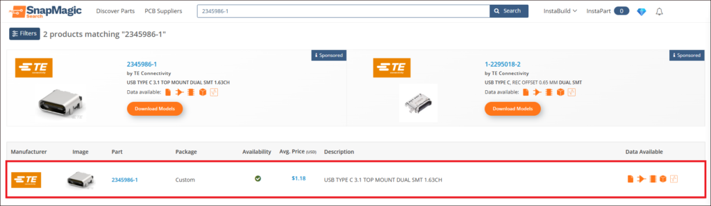 検索結果には該当する部品が一覧で表示され、部品ごとにシンボル、フットプリント、3Dモデルの有無が確認できます。目的の品番をクリックしてダウンロードページに移動します。