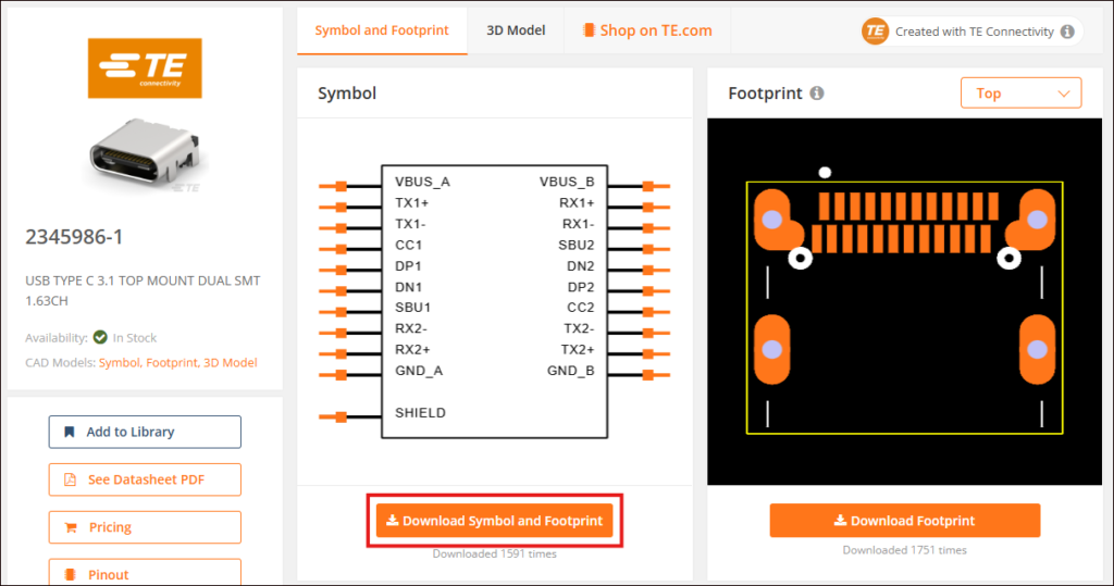 シンボルの枠内にある [Download Symbol and Footprint] をクリックすると、回路図のシンボルとPCBのフットプリントがセットでダウンロードできます。※3Dモデルが提供されていれば、一緒にダウンロードされます。