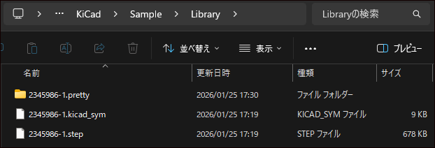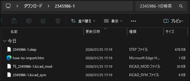 ダウンロードした Zip ファイルを解凍します。Zip ファイルの中には、シンボルライブラリファイルとフットプリントライブラリ、3D モデルが含まれています。