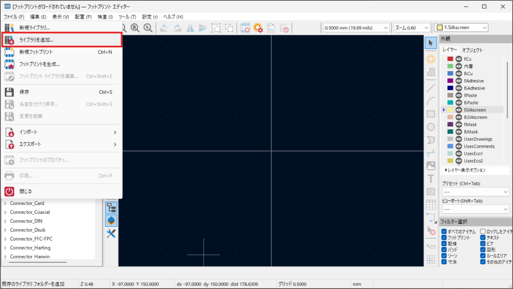 画面上部にあるメニューバーから [ファイル] -> [ライブラリを追加] の順に選択します。