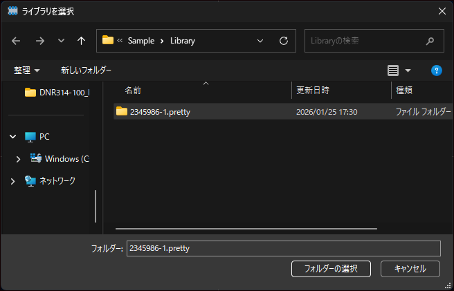 SnapMagic でダウンロードしたフットプリントライブラリが格納されている「.pretty」フォルダを選択します。